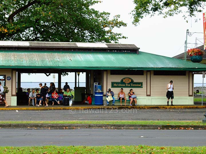 ヒロのダウンタウンにはモオヘアウバスターミナル(Mooheau Bus Terminal)があり、ここで乗降するのが分かりやすくて便利です。他の路線への乗り換えも簡単です。場所はダウンタウンのファーマーズマーケットから道路(カメハメハ・アベニュー)を海側に渡ったところです。