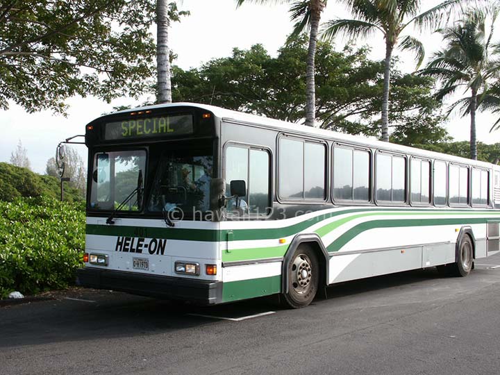 ハワイ島(ビッグアイランド)でも公共交通機関としてのバスが走っています。ハワイ島のバスはヘレオンバス(Hele-On Bus)と呼ばれていて、広大なビッグアイランドのほとんどの町に行くことができます。但し、ヘレオンバスは地元の人々の通勤利用が主目的なので、早朝にそれぞれの町を出発してヒロやコナの市街地、サウスコハラのリゾートなど仕事のある場所に向かい、午後になって仕事を終えた人々が地元に帰るというスケジュールで運行されています。そういう訳でヒロやコナに滞在している旅行者が、郊外にヘレオンバスで出かけるのは現実的ではありません。また日曜日は多くの路線が運休となっています。